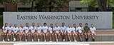 The Lady Jacks soccer team sits by the sign for EWU. During the training camp, …