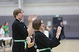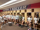 The Lady Jacks soccer team gathers around in the locker room at EWU. Jacks coach …