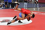 Warden junior Junior Santiago, in blue, takes down his opponent in the 138-pound finals of …