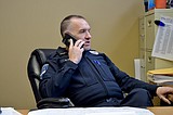 Moses Lake Police Chief Kevin Fuhr in his office on Wednesday taking a call from …