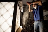 Tom Avril uses sawdust to demonstrates how the air filtering system works.