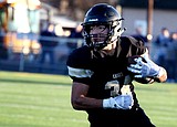 Dax Jenks (6) fights off a Lynden Christian defender on a run play during their …