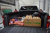 Christmas baskets and food are loaded into a community member’s truck to be delivered to …