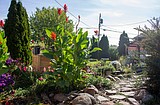 Plants, rock pathways, and wooden garden boxes fill and continue to expand in the backyard …