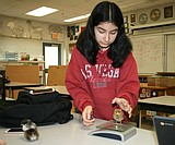 Jazmin Tapia collects data, which in this case means weighing a chick. The raising chickens …