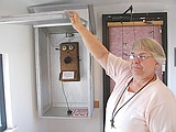 Sally Laufer shows an old phone booth in the Milwaukee Road Caboose at the Old …