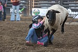Ruby Erickson hits the dirt after getting tossed from her sheep during the Mutton Bustin’ …