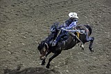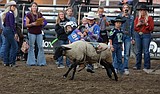 Blaise Freeman hangs on as he leaves the shoot during the saddle bronc riding event …