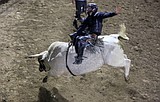 Trevor Reiste of Linden, Iowa, holds on as best he can during the bull riding …