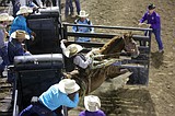 Leon Fountain of Socorro, New Mexico, holds on to his horse, Weary Joke, during the …