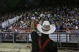 Rodeo clown J.W. Winklepleck amps up the crowd on Aug. 18 at the Northwest Ag …
