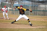 Jacoby Mugnos successfully makes it back to first base in the season opener for Moses …