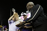 Washington Gov. Bob Ferguson, left, hands the Apple Cup trophy to Washington head coach Jedd …