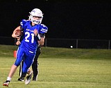 During one of the first and second grade flag football games, Wells Tait, seen in …