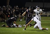 The ACH Warriors quarterback Max Grindy (12) slips a tackle on a designed run play …