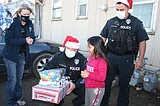 Othello Police Department school resource officer Seth Carlson (center) gives a 2020 Shop with a …