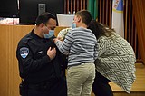 Newly sworn-in Moses Lake Police Officer Jose Ramirez has his badge pinned on by his …