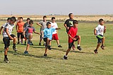 Bob Barrett photo - Would-be Huskie football players do warm up exercises during a youth …