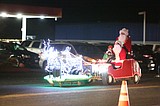 Multiple Santas and the reindeer head back to the barn after the Christmas in the …