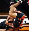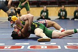 Quincy junior Anthony Averill, top, earns the fall at the 2A Boys District 5 tournament …