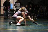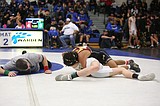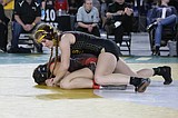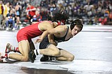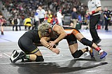 Othello sophomore Mason Russell, right, looks for an escape. Russell placed third in the 2A …
