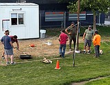 Crew members from McBoyz Contracting set up the patio area in front of the snack …