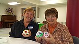 Sherri Feller, left, and Sam Miller, right, both members of Ephrata-Soap Lake Rocks, hold up …