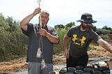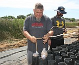 Andrew Allsbrook, left, checks the fuse on a fireworks shell while setting up the Freedom …