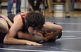 A Mavericks wrestler pins his opponent to the mat during an exhibition match in a …